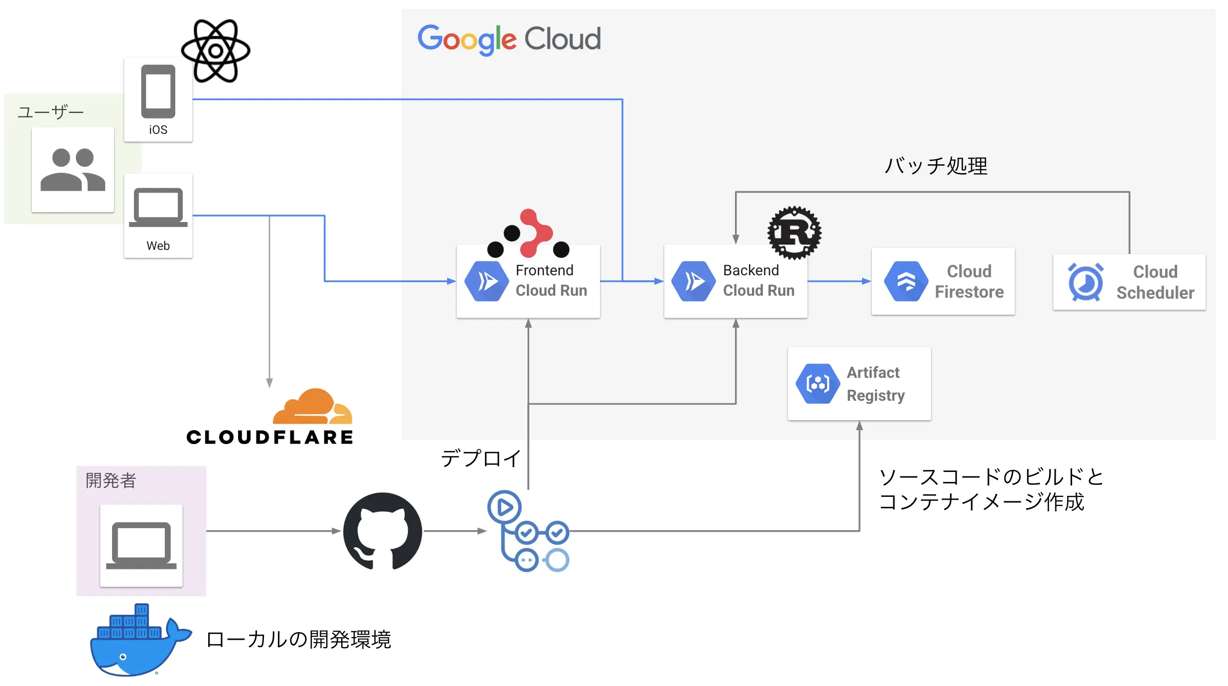 GCPCloud Run: アプリケーションのデプロイ先Firestore: NoSQL データベースCloud Scheduler: バッチ処理の定期実行Artifact Registry: コンテナイメージレジストリ