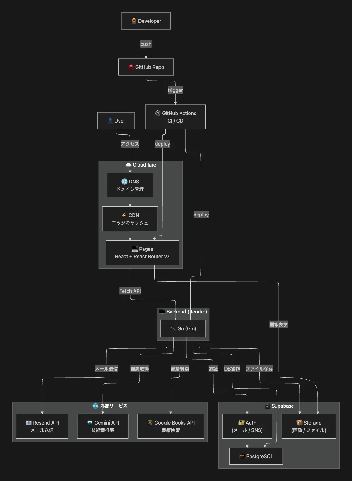 Supabase: データベース、認証、ストレージCloudflare: DNS + CDNCloudflare Pages: フロントエンドのホスティング